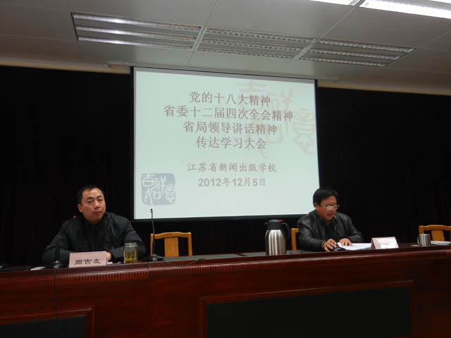 校党委书记、校长陈明坤同志主持大会,传达了江苏省委十二届四次全会精神和徐毅英局长在省新闻出版局学习宣传贯彻十八大精神大会上的重要讲话精神,要求全校干部职工深刻领会党的十八大的重大意义,认真解读十八大报告,并对我校学习贯彻十八大精神提出具体要求:各部门各支部要切实认真制定学习计划,党员干部带头学深学透,采取多种形式抓好学习,坚持联系实际、推动工作,不断开创学校改革发展的新局面。