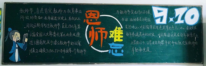 金秋九月不仅是丰收时节,更是一个感恩时节,我们迎来了一个特别的节日——教师节。古人说“饮其流者怀其源,学其成时念吾师”,在第35个教师节来临之际,校团委组织开展以“感恩老师,一路有你”为主题的黑板报评比活动。