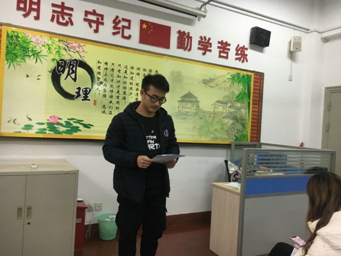 活动开始前,玩味书社活动部同学精心准备,还给每位同学都发了一篇本次诵读会的内容。首先为我们带来朗诵的是上周朗诵会中优秀朗读者1721班的李昂洋,他此次朗诵的作品是高尔基的经典《海燕》的节选。《海燕》又名《海燕之歌》,是高尔基创作的一篇著名散文诗。海燕在暴风雨来临之前,常在海面上飞翔。因此,在俄文里,“海燕”一词含有“暴风雨的预言者”之意。在李昂洋铿锵有力、充满激情的朗诵中,我们感受到了作者那坚强无畏的理想主义精神,豪情万丈,激荡人心。