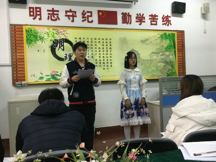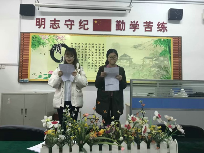 接下来是1521班刘泓和张琰琦带来唐代诗人张若虚的《春江花月夜》,诗作以江为场景,抒写了游子真挚动人的离情别绪以及富有哲理意味的人生感慨。两位女生的诵读为我们创造了一个深沉、廖廓、宁静的境界。