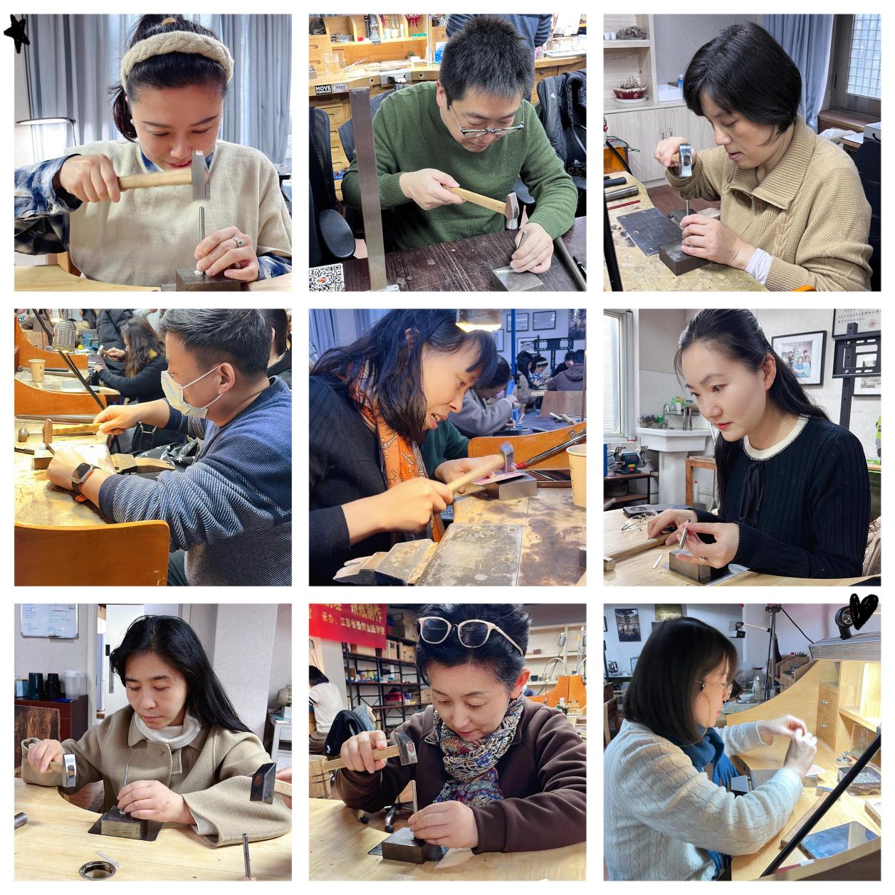 本次活动分为观看非遗艺术展品、非遗锻造技法讲解和互动实践研讨等三个环节。我校周凤玲老师介绍了学校与相关企业开展校企合作情况,学校邀请非物质文化遗产传承人及企业工艺美术师到校授课,深入课堂,让学生感知技艺之美、匠心之美,推进职业教育与传统文化教育融合发展。我校专业教师从“欣赏、技法、实践、创作、展示”等方面进行了“自然肌理”首饰制作项目介绍,通过图文并茂的形式,展示熔料、退火、酸洗、锻造、纹饰处理、抛光等技术。南京尚林文化创意国家级工艺美术师丁建带领老师们进行实际操作演示。在企业教师的指导下,教师们积极开展创作实践,体验制作设计流程的各个环节,感受了自然纹理錾刻的乐趣和巧妙,近距离感知非遗文化和工艺之美,并体验匠心设计工艺品制作。
