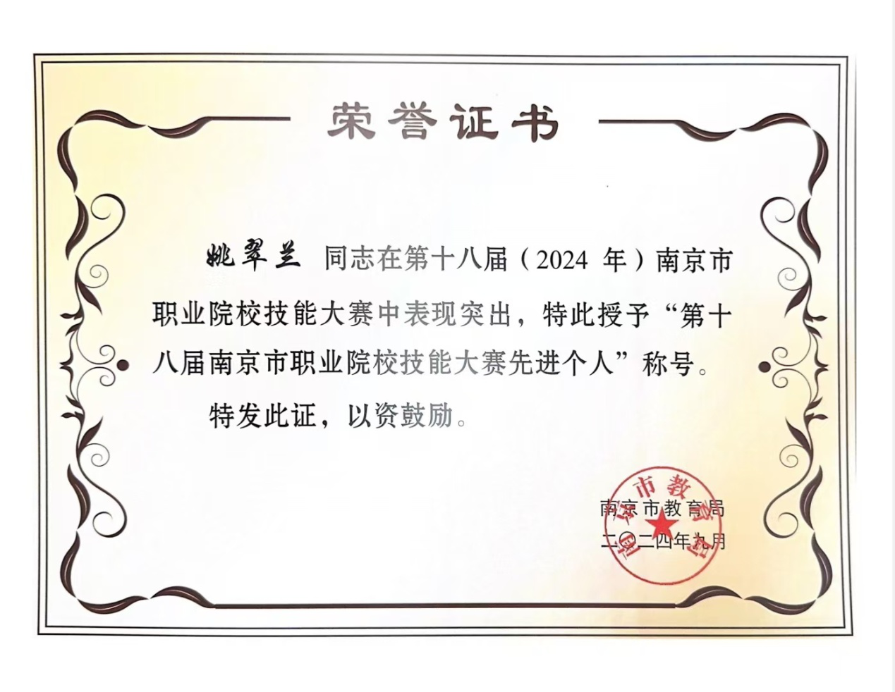 日前,南京市教育局公布2024南京市职业院校技能大赛表彰名单,我校姚翠兰老师被授予“第十八届南京市职业院校技能大赛先进个人”荣誉称号。