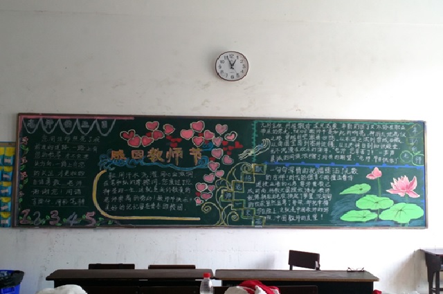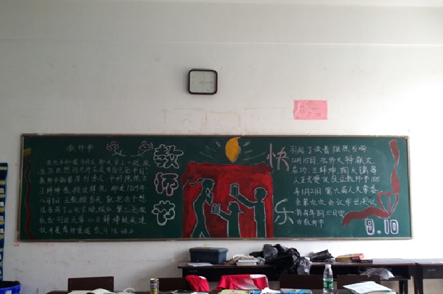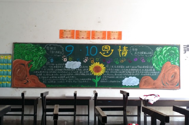 伴随着新学年的钟声,我们迎来了第32个教师节。在这个崇高的节日里,为了表达对老师的感激与祝福之情,加深师生之间的情感,教师节前夕,我校团委组织各班编辑出版了一期以“感恩园丁”为主题的黑板报。各班同学精心策划、认真绘写,一幅幅黑板报琳琅满目,给教室增添了亮丽的色彩,班级里洋溢着温馨的气氛。