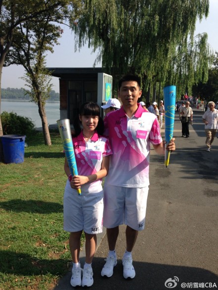本次亚青会火炬被称为“伙伴”火炬,由2—4名火炬手并排跑,进行火炬传递,每棒50米。 王欣悦所处的玄武湖畔道路比较窄,所以安排两名火炬手并排跑。王欣悦在火炬传递中的搭档是著名篮球运动员胡雪峰。火炬传递活动刚结束,胡雪峰就在本人的微博中上传了和王欣悦同学的合影,表达了对我校学子的赞誉,也给亚青会送上了美好祝愿。